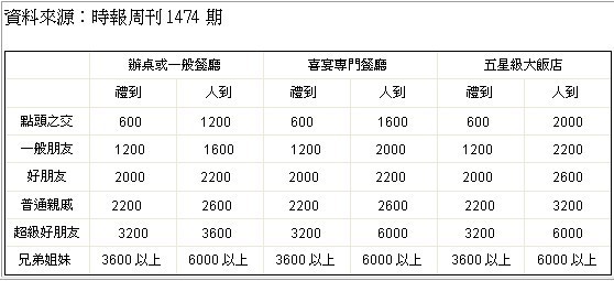 今天接到人生的第一張紅帖,男主角是公司的同事--Sam,喜宴辦在紐約紐約樓上的紅磡,沒想到這麼快就要包禮金了,問了問其他同事跟自己查了一下網路得到的結果,以我跟Sam不是很熟的交情,大概包個二千左右就可以了。最後附上在網路上查到的禮金表供參考。